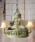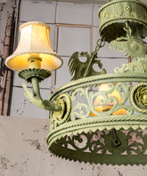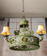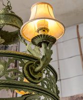 Esta lámpara antigua de forja con un acabado patinado en un tono verde viejo que sugiere el paso de los siglos dispone además en su estructura detalles ornamentales, como las águilas imperiales y las volutas florales. Del cuerpo principal emergen tres brazos curvados que sostienen tulipas cónicas de tela en un tono crema, difundiendo una luz cálida y acogedora. Ideal para salones amplios, comedores o recibidores con techos altos, esta lámpara no solo ilumina, sino que se convierte en un objeto de arte que infunde un aire de historia, nobleza y carácter a cualquier espacio.