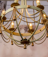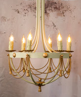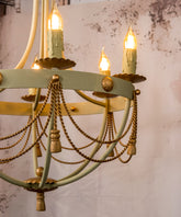 Esta encantadora lámpara colgante, con su diseño que evoca la sofisticación y el romanticismo de la Provenza francesa, es una pieza que transformará cualquier espacio. Su estructura de hierro, en un suave tono verde salvia con una pátina delicada, se adorna con un aro inferior del que penden cordones y borlas decorativas en un acabado dorado envejecido, aportando un toque de lujo sutil. Seis puntos de luz en forma de vela emergen del aro, creando una iluminación cálida y ambiental. El diseño se remata con una base superior que se eleva con una estructura de varillas curvadas, que le confiere ligereza y gracia. Es ideal para un comedor rústico, un salón con encanto o un recibidor, infundiendo un aire de tranquilidad y distinción.