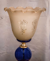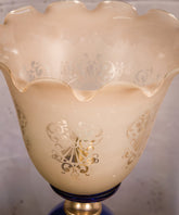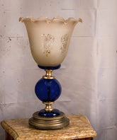 This table lamp is an expression of the richness of the Art Nouveau style, fusing materials and forms with distinctive beauty. Its gilded metal base supports a central element of cobalt blue glass, which contrasts exquisitely with the softness of the frosted opal glass shade. The shade, with its wavy edge and delicately engraved golden motifs, diffuses a warm and enveloping light, creating an intimate and welcoming atmosphere. It is a piece that not only illuminates, but also becomes a focal point, bringing a touch of sophistication and an echo of modernist fantasy to any corner of the home.