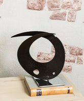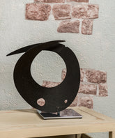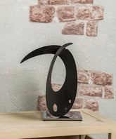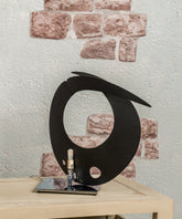This table lamp is a true piece of contemporary art, transcending its original function to become a luminous sculpture. Its abstract design, in matte black metal with a subtle hammered texture, features curved shapes and dynamic lines that play with the space. The light, which seems to emerge from its folds, creates a dramatic and mysterious effect, enhancing the silhouette of the object. It rests on a square chrome-plated metal base, providing an elegant and modern contrast. Ideal for a study, an entrance hall, or a side table in a minimalist living room, this lamp is not only a source of light, but a focal point that invites contemplation and conversation, infusing an air of avant-garde sophistication.