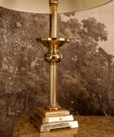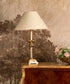 This table lamp, with a distinctly neoclassical style, radiates luxury and distinction. Its sturdy, slender base is crafted from brass with a polished gold finish that captures the light and adds a warm glow to the room. The design features a fluted shaft and turned details, culminating in a classic conical fabric shade in a soft cream hue, which diffuses a pleasant ambient light. Its elegant silhouette and balanced proportions make it the perfect choice for adding a touch of sophistication to a console table, desk, or side table, creating a focal point of light and timeless beauty.