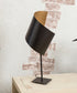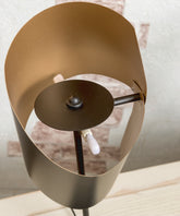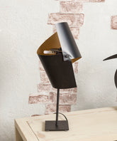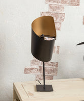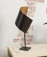 This table lamp, with a minimalist design and contemporary aesthetic, transcends simple lighting to become a true sculpture. Its shade, a curved metal cylinder in matte black, reveals a golden interior that projects a warm and inviting light. The dynamic silhouette of the shade, which appears to float above the shaft and rectangular base, creates a captivating play of shapes and shadows. Ideal for a modern desk, a side table in a minimalist living room, or a bedroom, this lamp not only illuminates, but also becomes a focal point, infusing an air of avant-garde sophistication.