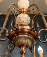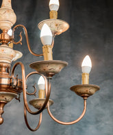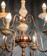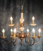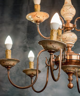 Esta lámpara de techo, con su diseño que evoca el encanto del estilo clásico, es una pieza que transformará cualquier espacio. Su estructura, elaborada en latón con un acabado en tonos cobrizos y una pátina natural, se despliega en ocho brazos curvados que sostienen los puntos de luz. Lo más distintivo son los detalles en cerámica en tonos crema con un delicado patrón floral, que se encuentran en el fuste central y los platillos de los candelabros, aportando un toque de romanticismo y artesanía. Es una lámpara que infunde una atmósfera cálida y distinguida, ideal para salones o comedores que buscan un punto focal de luz y belleza atemporal.