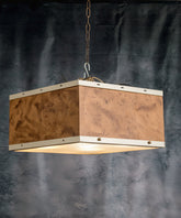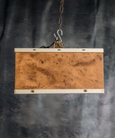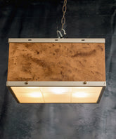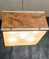 This striking ceiling lamp, with its clean lines and industrial aesthetic, is a piece that combines functionality with character. Its structure, in a beige or light gray tone, frames a central body with panels with a texture reminiscent of rustic wood grain, providing an interesting visual contrast. The lower part, with a diffuser that conceals the lights, projects a uniform and welcoming glow. Ideal for modern dining rooms, studios, or loft-style kitchens, this lamp not only illuminates, but also becomes a decorative element with great personality, infusing the room with a designer feel and industrial warmth.