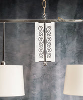 This pendant lamp, with its clean lines and the sophistication of Art Deco style, combines functionality with distinctive design. Its main structure, finished in chrome, features a horizontal bar from which two cylindrical fabric shades in a soft cream shade hang, diffusing a warm, even light. The center of the lamp is adorned with decorative metal panels featuring elegant arabesque engravings, adding a touch of delicacy and additional visual interest. Ideal for illuminating a dining table, a kitchen counter, or an entryway, this lamp is a testament to design that transcends time, adding a functional and aesthetic point of light to any interior.