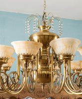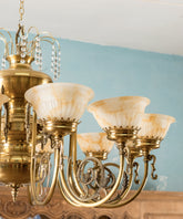 This magnificent ceiling lamp, steeped in Victorian heritage, is a centerpiece that will transform any room. Crafted from gilt bronze, it features a classic design with a touch of subtle opulence. Its curved arms hold veined amber Murano glass shades, which diffuse a warm, enveloping light. A distinctive detail is the cascade of small crystals that hang from the top, adding a touch of understated sparkle that evokes the sophistication of bygone eras.