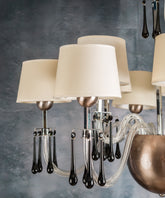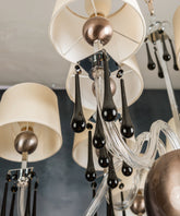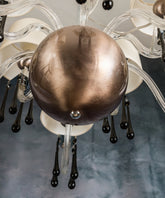 This ceiling lamp combines classic elegance with a contemporary and dramatic touch. Its structure, with a lustrous silver finish, features curved arms of clear crystal that flow gracefully from a central spherical body in a coppery tone. Numerous Swarovski crystal droplets in a deep black shade hang from these arms and from the center, creating a captivating visual contrast. The ten light sources, each with a conical cream-colored fabric shade, diffuse a soft, enveloping light. This lamp not only illuminates, but also becomes a true work of art, ideal for living rooms, dining rooms, or hallways seeking a stylish statement.