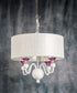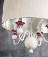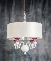 This charming ceiling lamp combines the delicacy of the Rococo style with a contemporary touch and a fresh color palette. Its metal frame, in a soft matte white finish, features curved arms holding bulb caps and crowned by original mauve or fuchsia shades. The lamp is topped with a large cylindrical shade made of methacrylate and white fabric with subtle pleating, which diffuses a warm and enveloping light. Ideal for a charming bedroom, a romantic living room, or even a dining room, this lamp not only illuminates, but also becomes a decorative element with great personality, providing an air of fantasy and renewed sophistication.