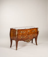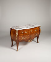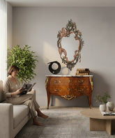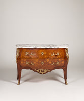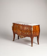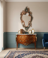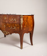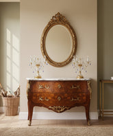 Esta cómoda bombé de estilo Luis XV es una pieza de lujo que transformará cualquier espacio. Con sus delicadas marqueterías florales, su sobre de mármol y sus bronces dorados, es el mueble perfecto para añadir un toque de sofisticación y opulencia a tu salón, recibidor o dormitorio.