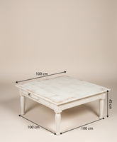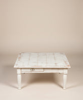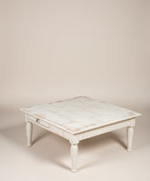 Descubre esta mesa de centro cuadrada de madera en estilo provenzal. Su acabado decapado y diseño rústico aportarán calidez a tu salón. Pieza única.