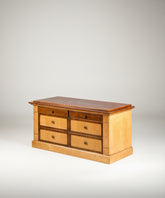 Este mueble auxiliar bicolor en madera maciza es una pieza sólida y funcional que recuerda a los antiguos mostradores de comercio.