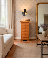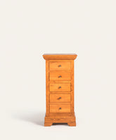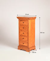 Este mueble cajonera es una pieza que celebra la belleza en estado puro de la madera de roble macizo, el auténtico protagonista de su diseño. Su formato alto y estrecho es tan elegante como funcional, ofreciendo un generoso espacio de almacenaje en sus cinco cajones. El acabado a la cera, aplicado artesanalmente, no busca esconder, sino realzar la espectacular veta y los nudos del roble, aportándole una calidez y una pátina color miel incomparables. Es un mueble con alma, una torre de serenidad y orden para el dormitorio o cualquier rincón del hogar que necesite carácter y belleza natural.