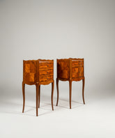 Esta pareja de mesitas francesas estilo Luis XV con marquetería floral y patas cabriolet.
