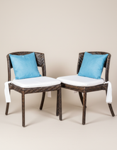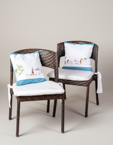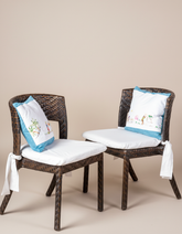 These garden chairs, with their synthetic rattan frame and original embroidered cushions, are perfect for creating a cozy corner in your outdoor space. The synthetic rattan offers strength and durability, while the cushions, embroidered with traditional scenes, add a touch of personality and color.