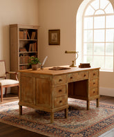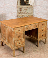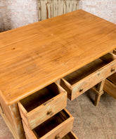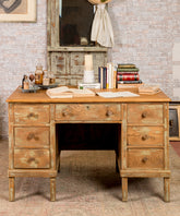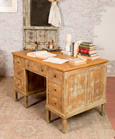 This antique solid wood desk stands out for its generous storage capacity and charming vintage style. With seven drawers of varying sizes and a distressed finish that showcases the wood's natural beauty, it's an ideal piece for those seeking functionality and a touch of history in their workspace.