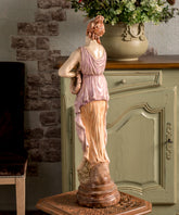 Capture the essence of classical beauty and serenity with this polychrome ceramic sculpture. Depicting a standing female figure in a graceful and contemplative pose, dressed in elegantly draped Greco-Roman-style robes, this piece evokes the elegance and idealism of bygone eras. The soft pastel tones of her clothing and the delicate modeling of her face, gathered hair, and hands stand out against the integrated base that serves as a pedestal. Crafted from ceramic with a painted finish that simulates naturalistic texture and color, this sculpture is a striking decorative object, ideal for enhancing a console table, mantelpiece, or bookshelf, bringing a touch of art, culture, and timeless sophistication to any setting.