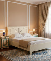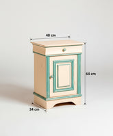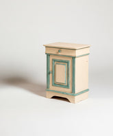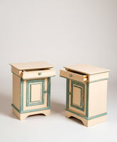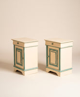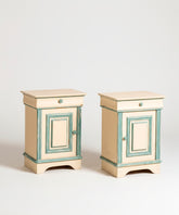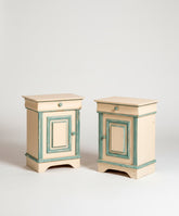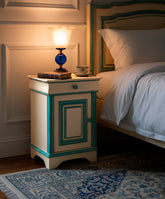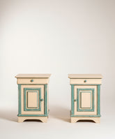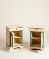 Esta pareja de mesitas de noche presentan una estructura de líneas puras y equilibradas en un suave color crema. El carácter de la pieza se revela en sus perfiles: todas las molduras han sido pintadas a mano en un vibrante azul turquesa, aplicado con una delicada pátina desgastada que le confiere una personalidad artesanal y única. Son funcionales, con su cajón y armario inferior, pero sobre todo son increíblemente decorativas, perfectas para flanquear una cama y aportar un toque de frescura y sofisticación al dormitorio.