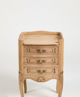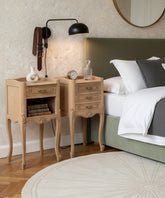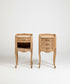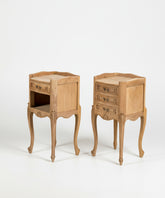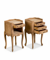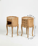 Descubre esta elegante pareja de mesitas de noche estilo Luis XV en madera natural. Diseño clásico con tallas a mano, ideal para personalizar tu dormitorio.
