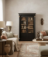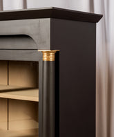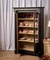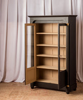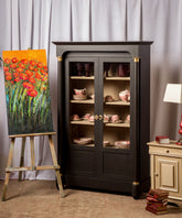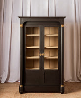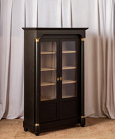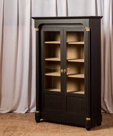 This impressive display case, in a distinct Empire style, combines sobriety and classic grandeur with a touch of distinction. Its structure, finished in an elegant matte black, is enhanced with gold details on the side columns and door knobs, creating a sophisticated contrast. The two glass doors allow for elegant display of collections or tableware, while the interior shelves offer ample storage space. Its design and size make it the perfect piece of furniture for a living room, dining room, or library, providing an air of authority and providing an ideal backdrop for precious objects.