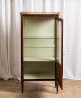 The interior, in a soft light green hue, provides the perfect backdrop for porcelain, books, or pieces of art. Its slender, fluted legs with bronze finials lend a light and distinctive look, making this display case a striking centerpiece in any living room or study.