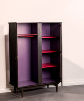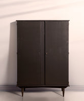 Descubre la elegancia y la estética del diseño de mediados de siglo con este sobrio y estilizado armario vintage. Su silueta compacta, caracterizada por líneas rectas y una apreciada estética minimalista, se realza con un acabado en negro o un tono muy oscuro que le confiere una presencia sofisticada y versátil. Las dos puertas lisas, desprovistas de tiradores y únicamente marcadas por discretas bocallaves, ocultan un práctico espacio interior de almacenaje. El cuerpo del armario se eleva sobre cuatro patas cónicas e inclinadas hacia el exterior, un rasgo icónico del diseño Mid-Century Modern y Escandinavo. Una pieza atemporal y muy funcional, perfecta para dormitorios, salones o incluso recibidores que buscan añadir un toque de estilo retro, almacenaje eficiente y un diseño impecable que no pasa de moda.