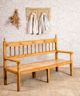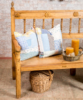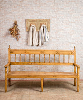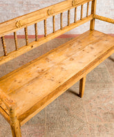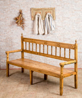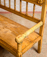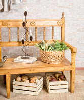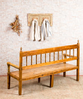 Este banco antiguo de madera maciza es una pieza que destaca por la belleza de su artesanía y su estilo rústico. Con un respaldo tallado con motivos florales y un acabado natural que resalta la calidez de la madera, es un mueble ideal para añadir un toque de historia y encanto a cualquier espacio.