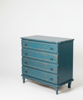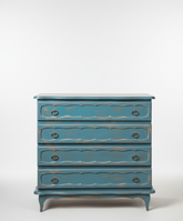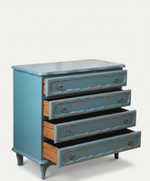 Esta cómoda es una pieza que irradia frescura y un inconfundible encanto vintage, con un toque provenzal. Cuidadosamente restaurada, luce un acabado decapé en un hermoso tono azul turquesa, donde sutiles desgastes revelan la madera original, aportando una pátina auténtica y atractiva. Sus cuatro amplios cajones con tiradores de argolla metálicos, ofrecen un generoso espacio de almacenamiento. Las líneas suaves y la base delicadamente moldeada, evocan la ligereza del mobiliario de antaño. Ideal para un dormitorio, un recibidor o incluso un salón, esta cómoda no solo es funcional, sino que infunde una atmósfera de alegría y un estilo único a cualquier estancia.