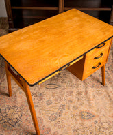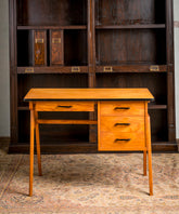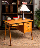 Este escritorio mid century es una pieza auténtica que captura la esencia del estilo de mediados de siglo con sus líneas limpias, funcionalidad inteligente y estética atemporal que sigue inspirando hoy en día. Fabricado en madera con un cálido acabado en tono miel, destaca por sus características patas cónicas e inclinadas y una configuración asimétrica de cajones: uno amplio y poco profundo bajo el tablero principal y un bloque de tres cajones apilados a la derecha, todos adornados con tiradores lineales y discretos. El sutil detalle del borde oscuro que enmarca el tablero añade un toque gráfico distintivo. Perfecto para crear un espacio de trabajo con carácter y estilo, este escritorio no es solo un mueble, sino una inversión en diseño icónico que aportará sofisticación y un aire retro chic a cualquier estancia.