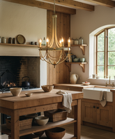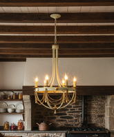 Esta encantadora lámpara colgante, con su diseño que evoca la sofisticación y el romanticismo de la Provenza francesa, es una pieza que transformará cualquier espacio. Su estructura de hierro, en un suave tono verde salvia con una pátina delicada, se adorna con un aro inferior del que penden cordones y borlas decorativas en un acabado dorado envejecido, aportando un toque de lujo sutil. Seis puntos de luz en forma de vela emergen del aro, creando una iluminación cálida y ambiental. El diseño se remata con una base superior que se eleva con una estructura de varillas curvadas, que le confiere ligereza y gracia. Es ideal para un comedor rústico, un salón con encanto o un recibidor, infundiendo un aire de tranquilidad y distinción.