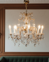 Esta suntuosa lámpara de araña, con su diseño que evoca la opulencia de las piezas de cristal del siglo XIX, es una verdadera joya que transformará cualquier estancia. Su estructura dorada con cristal, se adorna con una profusión de cadenas y colgantes de cristal transparente. Lágrimas facetadas y esferas talladas penden de sus brazos, creando un efecto cascada que captura y refracta la luz con un brillo hipnótico. Seis puntos de luz en forma de vela emergen de sus brazos, aportando una iluminación cálida y teatral. Ideal para salones con techos altos, comedores señoriales o recibidores, esta lámpara no solo ilumina, sino que se convierte en una obra de arte que infunde un aire de romanticismo y grandiosidad atemporal.