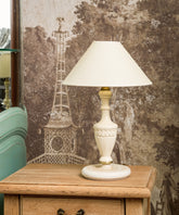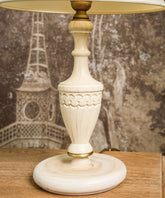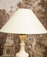 Hay objetos que, por su sencillez y elegancia, tienen el poder de crear un ambiente de calma y armonía. Esta lámpara de sobremesa es uno de ellos. Su pie, de latón torneado con una clásica forma de urna, es el lienzo perfecto para un delicado acabado patinado en tonos marfil, que le otorga una profundidad y una textura llenas de carácter. Un sutil friso con motivos geométricos tallados a mano rodea su cuerpo, añadiendo un toque de distinción artesanal, mientras que pequeños detalles en latón aportan un cálido contrapunto metálico. Se completa con una pantalla cónica en un tono crudo a juego, que difumina la luz para proyectar un resplandor suave y acogedor, perfecto para cualquier rincón que necesite un toque de serenidad.