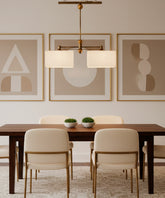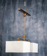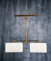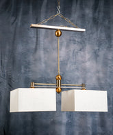 Esta lámpara es una escultura lumínica que rinde homenaje al mejor diseño de mediados de siglo. Concebida para ser la protagonista sobre una mesa de comedor o una isla, su estructura lineal y perfectamente simétrica aporta un toque de elegancia arquitectónica a cualquier espacio. Está realizada en metal con un cálido acabado en latón envejecido, y su diseño se ve acentuado por esferas decorativas que le confieren un ritmo visual. En cada extremo, dos elegantes pantallas rectangulares en color lino crudo parecen flotar, listas para difundir una luz suave, cálida y acogedora. Es la pieza perfecta para enmarcar cenas, charlas y momentos especiales.