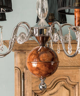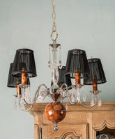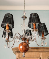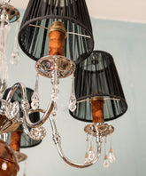 Hay piezas que iluminan una estancia y otras que, además, la visten de gala. Esta lámpara de techo con cristal de Swarovski pertenece, sin duda, al segundo grupo. Sobre una estructura de cinco brazos en metal cromado, de líneas sinuosas y brillantes, descansan detalles que la hacen única: una esfera central y unos portavelas acabados en madera de raíz, cuya veta aporta una calidez orgánica y lujosa. Delicados caireles de cristal añaden destellos de luz, mientras que las cinco tulipas de tela negra ponen el contrapunto dramático, tamizando la luz para crear una atmósfera íntima y acogedora. Es una joya escultural que no dejará a nadie indiferente.