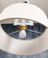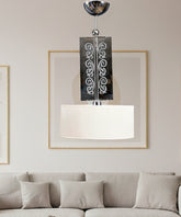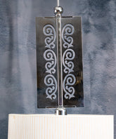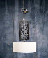 Esta lámpara es una audaz y elegante declaración de estilo, una pieza que juega magistralmente con los contrastes. Su diseño fusiona la modernidad del metal cromado con la delicadeza de la ornamentación clásica. El elemento central es una placa rectangular de cromo pulido, sobre la que se ha calado una filigrana de volutas de inspiración barroca, creando un efecto de encaje metálico. Esta estructura central queda envuelta por una gran pantalla cilíndrica de tela a rayas en un suave tono crudo, que difumina la luz para proyectar un resplandor suave y acogedor. Es una auténtica joya suspendida, perfecta para aportar un toque de glamour y originalidad a un salón o dormitorio.