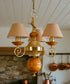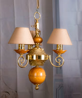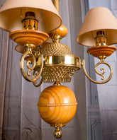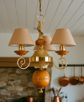Esta lámpara de techo es una pieza de una elegancia cálida y sofisticada, un magnífico ejemplo de cómo la combinación de materiales nobles puede crear una atmósfera única. Su diseño de inspiración clásica fusiona el brillo del latón dorado con la calidez de la madera de pino. El cuerpo central es un juego de texturas, alternando el metal pulido, un bello relieve en cestería y esferas de madera torneada en un luminoso tono miel. De él nacen tres brazos de líneas curvas y clásicas, rematados por sencillas y elegantes pantallas de tela en color beige, que tamizan la luz creando un ambiente acogedor. Es la pieza central perfecta para un salón o comedor que busque una iluminación distinguida y llena de calidez.