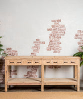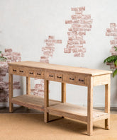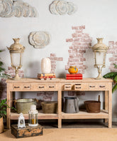 Esta mesa consola industrial de madera es una pieza práctica y elegante que añade un toque de calidez y carácter a cualquier espacio. Su diseño sencillo, su amplio almacenamiento y su acabado de madera natural la convierten en una opción muy versátil para decorar.