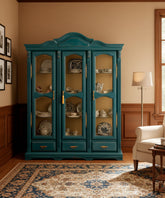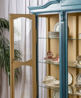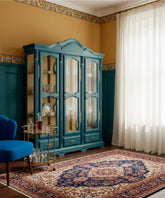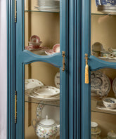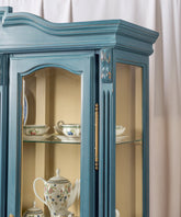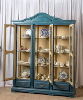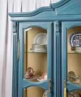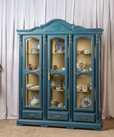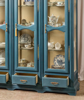 Esta vitrina antigua francesa, de marcado estilo clásico, es una pieza que aúna la tradición con una explosión de color y un acabado actual. Su estructura, acabada en un vibrante azul mediterráneo o petróleo con sutiles desgastes, presenta una silueta majestuosa con una cornisa superior y detalles tallados en las pilastras. Tres puertas acristaladas, con marcos dorados que añaden un toque de lujo, revelan un interior amplio con baldas de cristal, perfectas para exhibir porcelanas, cristalería o colecciones. Los tres cajones inferiores, con tiradores dorados, ofrecen un almacenaje discreto. Es el mueble perfecto para un comedor o salón, infundiendo un aire de frescura, elegancia y funcionalidad renovada.