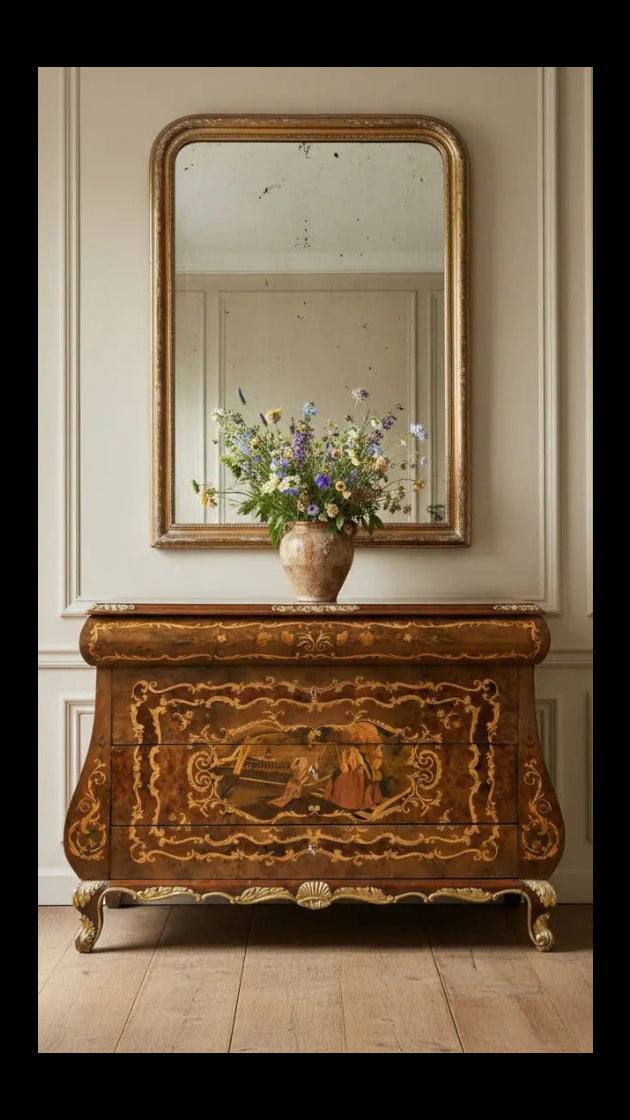 Gran cómoda bombé estilo Luis XV con marquetería, bronces y tapa de mármolGran cómoda bombé estilo Luis XV con marquetería, bronces y tapa de mármol- Precio regular
